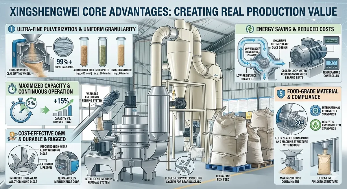 中国の何千もの飼料加工工場、水生飼料工場、大規模な家畜および家禽の飼料生産ラインはすべて、この押出飼料超微粉砕機を使用しています。その主な理由は、この装置が耐久性、作業効率、製品品質のバランスを保ちながら、膨らんだ飼料を粉砕するという問題を正確に克服し、市場の通常の粉砕機をはるかに上回っているためです。通常のモデルは膨化飼料の特殊な食感と密度に適応することが困難ですが、Xingshengweiは長年の研究開発と製造経験に基づいて、高硬度で調整可能な水分を備えた膨化材料の構造設計を徹底的に最適化し、生産ラインの24時間連続のスムーズな稼働と一貫した製品品質を完全に保証し、業界の顧客の長期的な信頼を獲得しています。