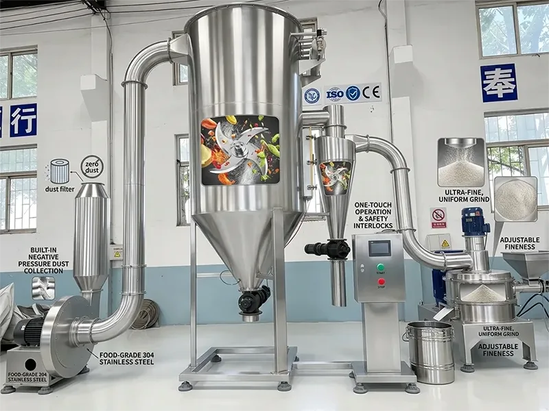 4. 規格に準拠した安全で環境に優しい:機械全体が完全に密閉された設計を採用しており、粉塵の漏れがなく、動作環境がよりクリーンになり、環境要件を厳密に満たします。食品グレードの材料と GMP 標準設計の組み合わせにより、砕いた果物と野菜の粉末は無臭で無公害であることが保証され、食品加工や健康製品の生産などのハイエンドのシナリオで直接使用できます。装置の動作音は適正な範囲に抑えられており、周囲に迷惑をかけません。
