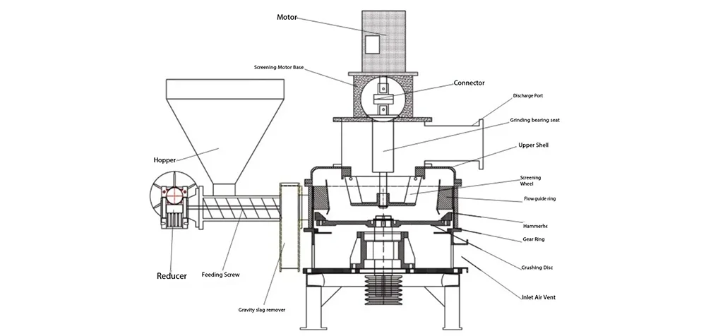 具体的な処理フローはシンプルで、まず粒径10mm以下の粗粉原料を投入ホッパーに投入し、可変周波フィーダーで一定速度で粉砕室まで搬送する。粉砕室内の粉砕ディスクが高速回転し、粉砕ハンマーと粉砕ローラーが同期して高速回転し、強力な遠心力を発生させ、粗粉原料を粉砕室内壁に投入します。遠心力の作用により、原料は耐摩耗性ライニングプレート、破砕ハンマー、破砕ローラーとの激しい衝突、せん断、摩擦を受けて予備破砕が完了します。最初の粉砕後、材料は誘起通風ファンによって生成される負圧気流によって分級チャンバーに運ばれます。分級室内の分級ホイールが高速回転し、粒度に応じて正確に分級します。要件を満たす超微粉(粒子径は必要に応じて調整可能)が気流によってコレクターに運ばれ、回収が完了します。粒子サイズの要件を満たさない粗粉は分級ホイールによって捕らえられ、指定された粒子サイズ標準に達するまで二次粉砕のために粉砕チャンバーに戻され、最終粉体の均一性が確保されます。