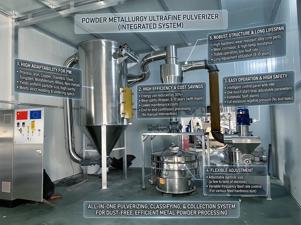 粉末冶金用超微粉砕機は、粉末冶金業界のために特別に開発された特殊な装置です。主に金属粉末、合金粉末、およびさまざまな非金属粉末原料の超微細加工に使用され、粉末冶金生産プロセス全体の原料処理要件に完全に適応できます。通常の粉砕装置と比較して、粉末冶金超微粉砕機の最も顕著な特徴は、粉末冶金業界の厳格な基準に準拠していることであり、粉末の粒度を正確に制御し、均一な粒子分布を確保し、二次汚染を完全に回避し、最終粉末の高純度を保証し、その後の成形、焼結などのプロセスの中核要件を完全に満たします。