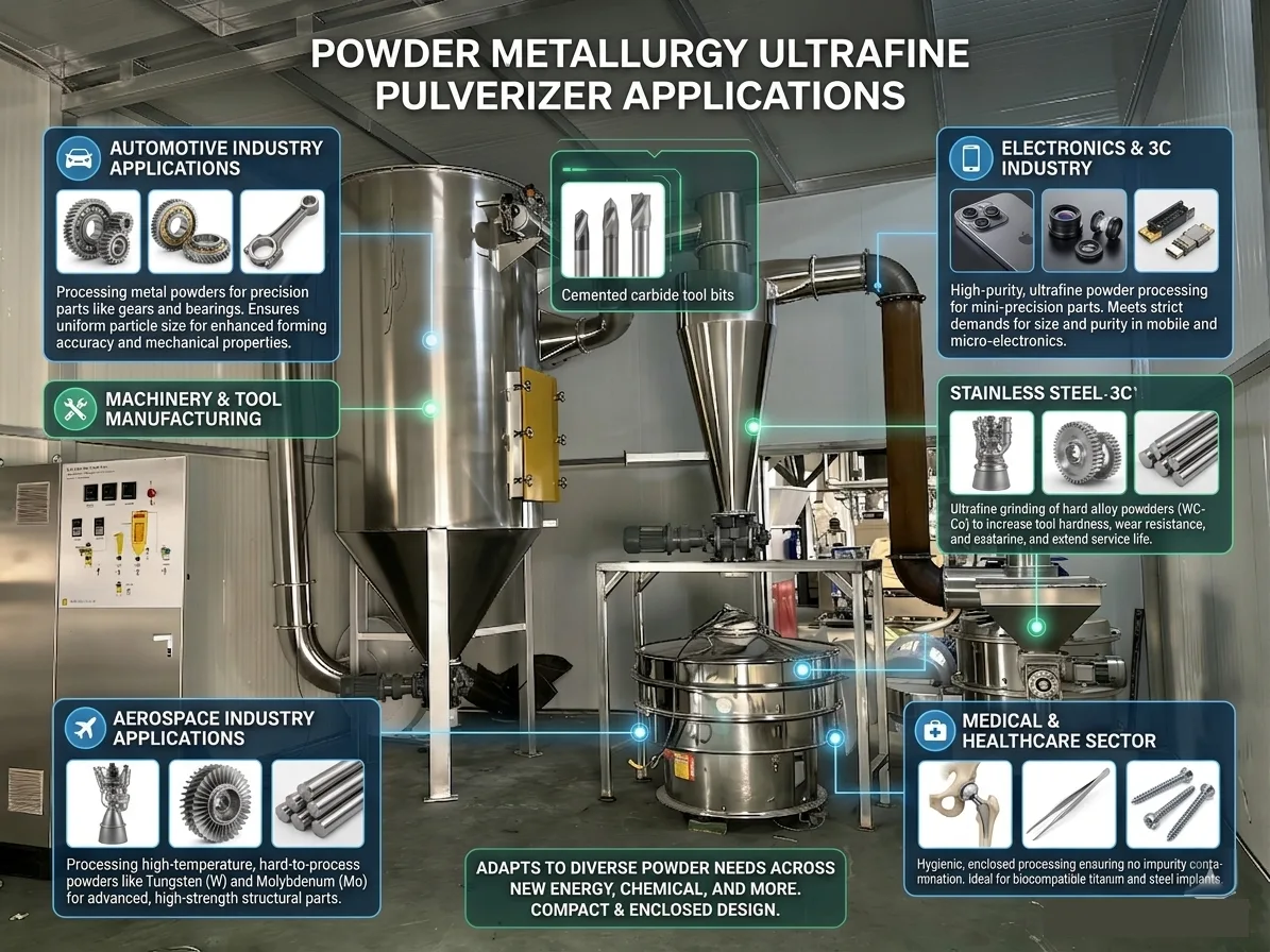 粉末冶金用超微粉砕機は、主に粉末冶金業界全体の原料の超微粉加工に使用され、さまざまな金属、合金、非金属粉末の粉砕処理に適応できます。自動車、機械、エレクトロニクス、航空宇宙、医療、工具製造などの複数の分野で広く使用されています。具体的なアプリケーション シナリオは次のとおりです。